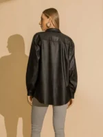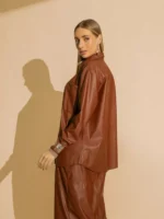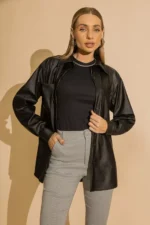 A Camisa Juliete combina elegância e modernidade, confeccionada em couro ecológico. Seu design clássico apresenta abotoamento frontal e nos punhos, gola com pé de gola e bolsos frontais que adicionam funcionalidade e estilo. Uma peça versátil e sofisticada para composições contemporâneas. Aposte e combine com a Saia Midi Jamine!