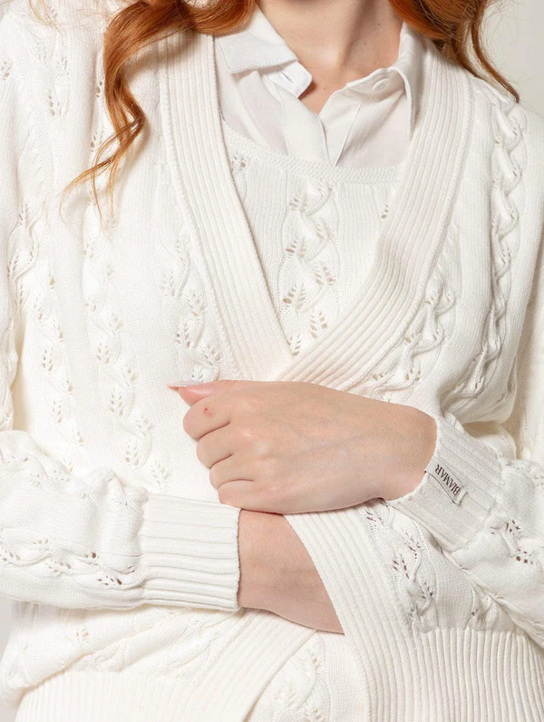 Casaco Beth em algodão com pontos vazados, sem fechamento frontal e mangas de cava posta Biamar é ideal para criar um look elegante e confortável. Aposte e combine com a Regata Beth!