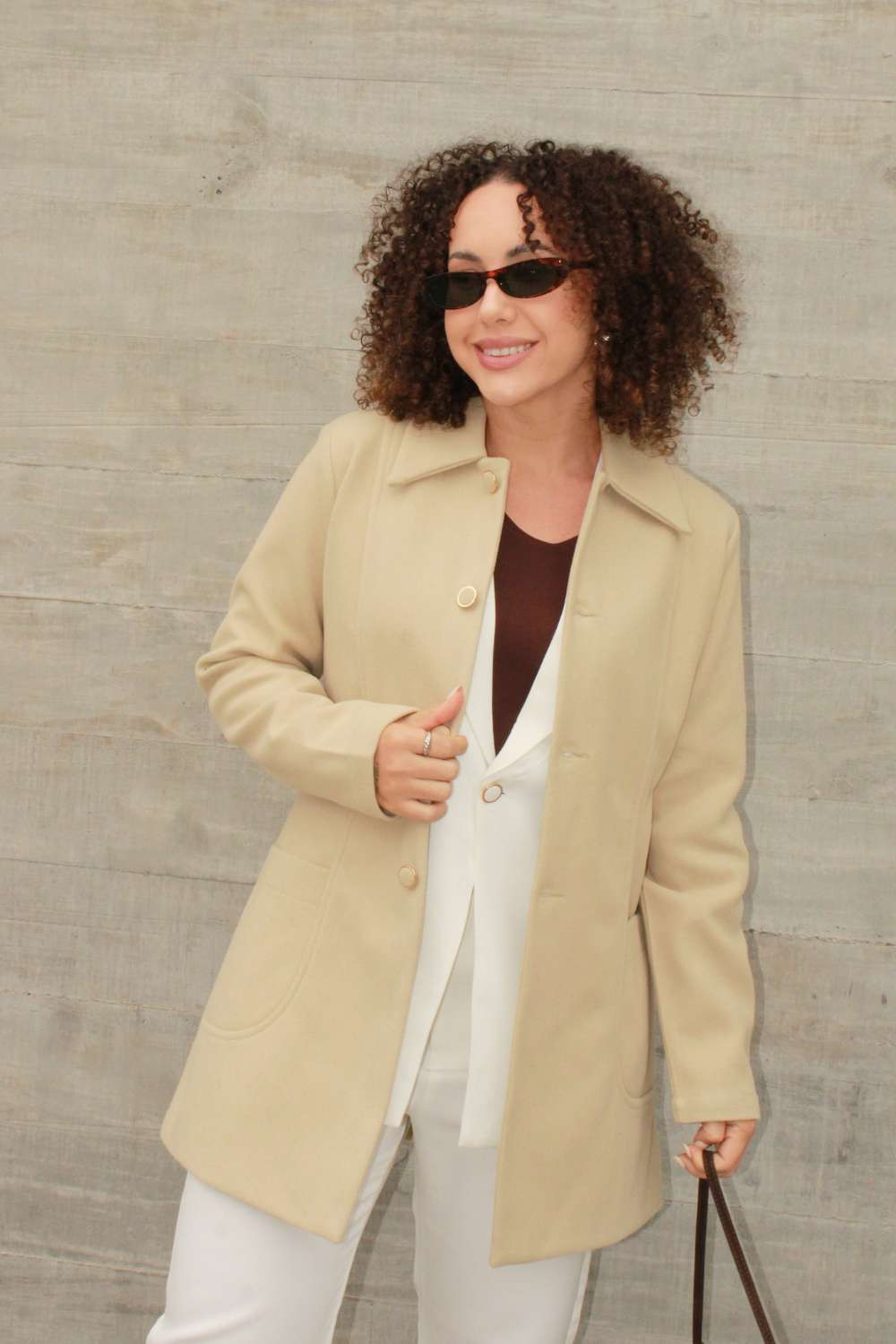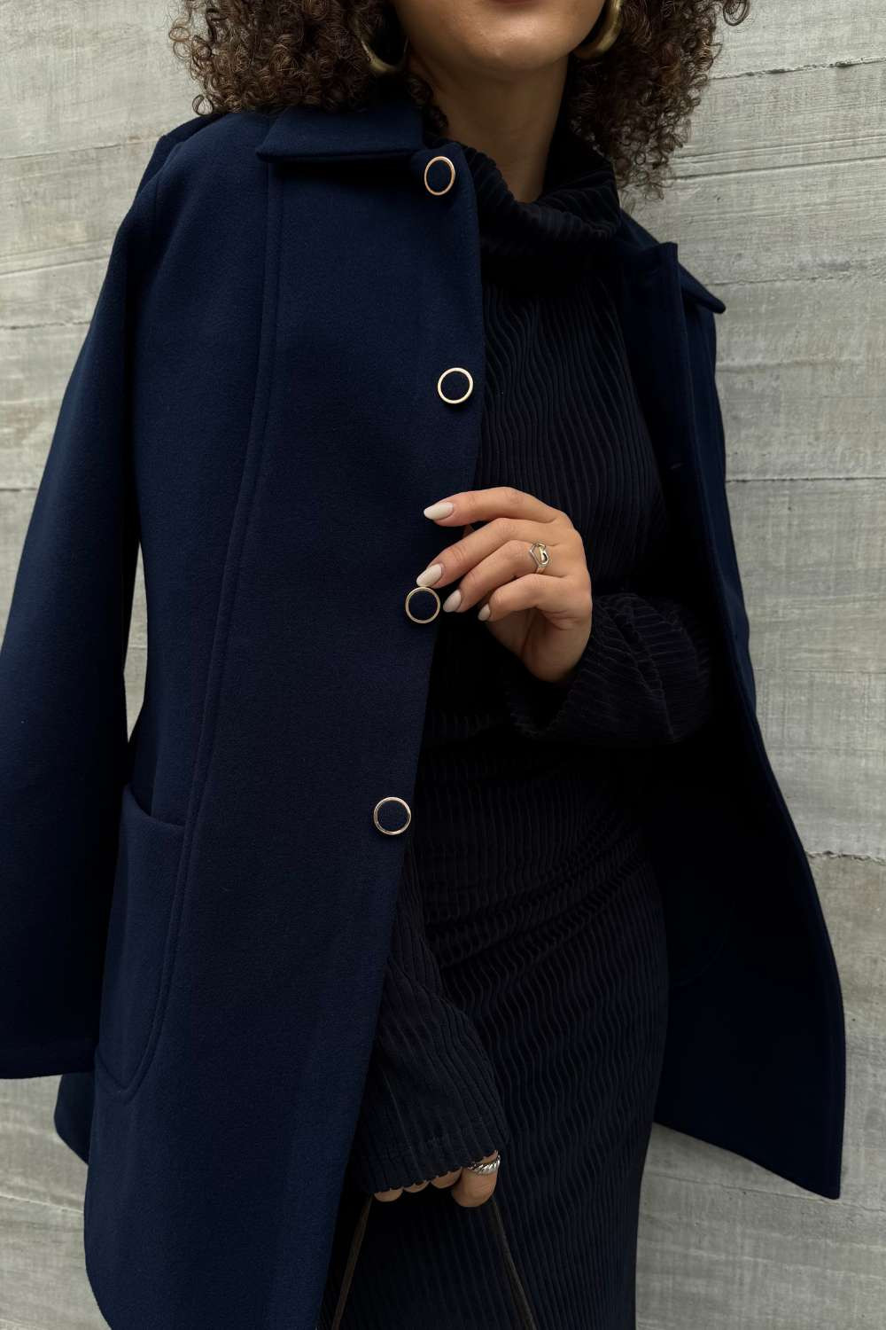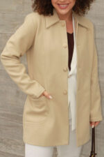Casaco em malha feltro pesada. Abertura frontal com botões forrados com anel dourado e bolso na frente. A peça te mantem aquecida para os dias de frio intenso!