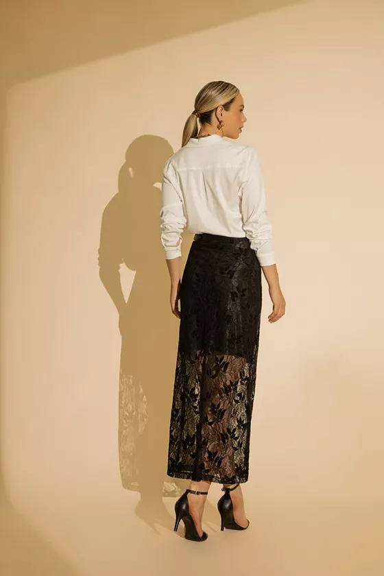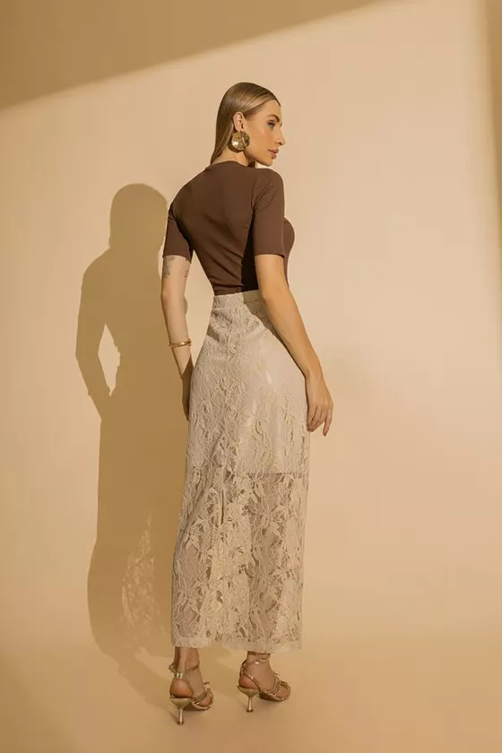A Saia Maxi Nicole é confeccionada em renda, uma peça delicada e elegante. Seu design conta com cós alto, que proporciona um ajuste impecável, e zíper lateral para facilitar o uso. Possui fenda traseira proporcionando um toque elegante, uma saia perfeita para compor looks refinados e modernos para diversas ocasiões. Aposte!