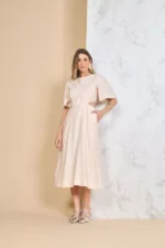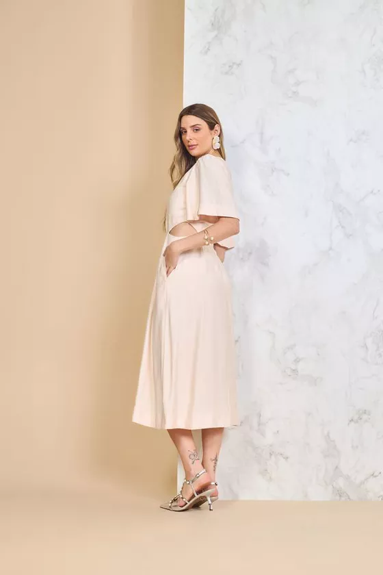 O Vestido Cybeli é confeccionado em Alfaiataria Resort, garantindo elegância e sofisticação. Destaca-se pelas mangas amplas, conferindo um toque de modernidade. Possui recortes vazados na cintura para valorizar a silhueta. Equipado com bolsos laterais para praticidade. Apresenta zíper invisível nas costas, juntamente com abertura na gola e botão, proporcionando um fechamento discreto e refinado. Ideal para ocasiões especiais.