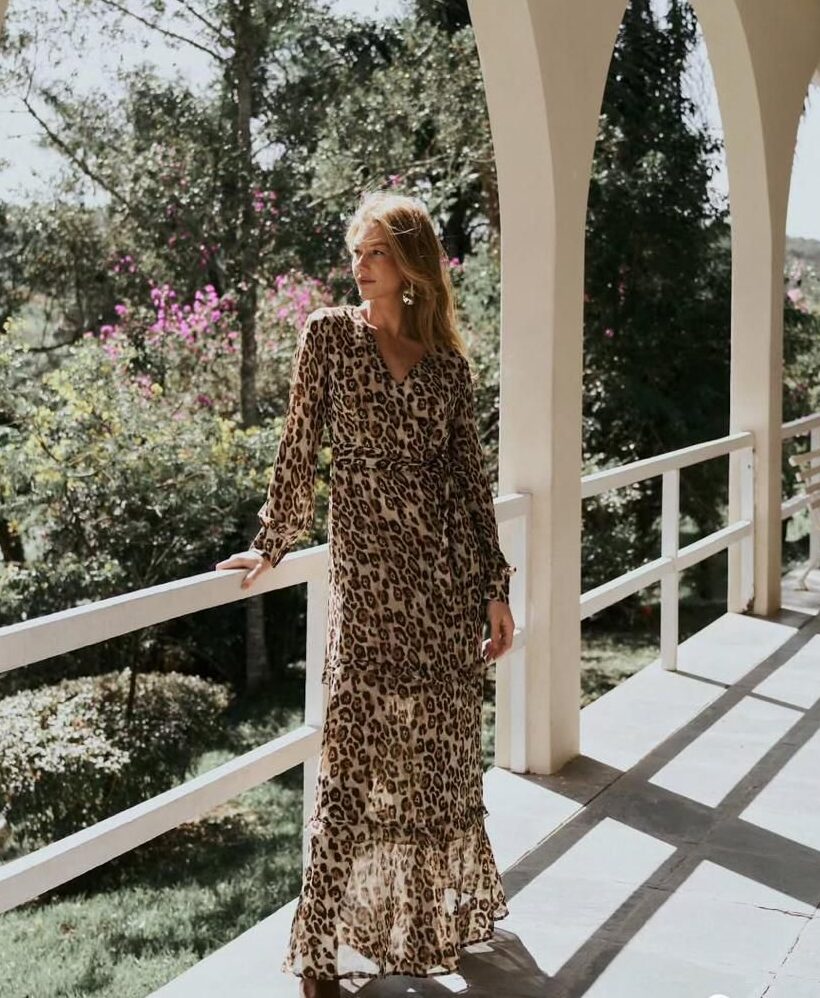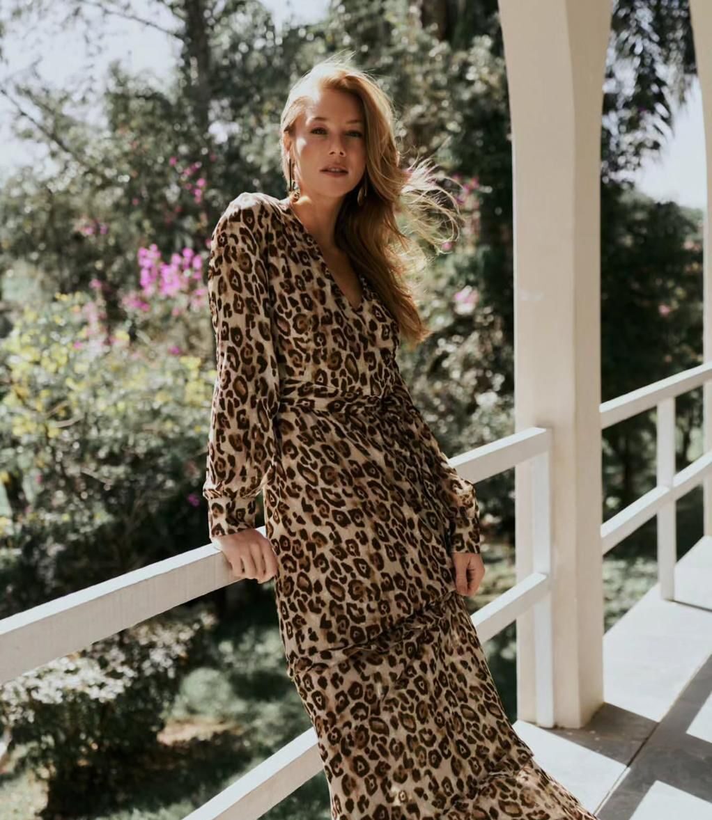 Vestido longo com estampa animal print, decote em V e mangas longas. Fluido e sofisticado, garante um visual moderno e cheio de personalidade.