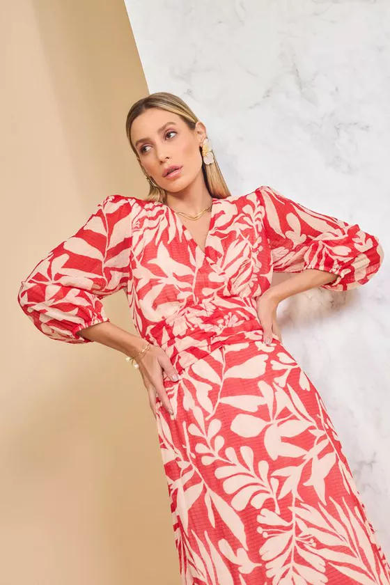 O vestido Maxi Pietra é uma peça confeccionada em Crepe Estampado Crinckle, ele é caracterizado por mangas longas com elástico ajustado ao braço, proporcionando um visual romântico e moderno. Destaca-se pelo decote em V transpassado, valorizando o colo. Apresenta recorte na cintura com babados, adicionando charme e feminilidade ao design. Além disso, possui babado maria na barra, complementando o visual com movimento e elegância. Ideal para ocasiões especiais com um toque de sofisticação.