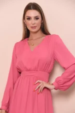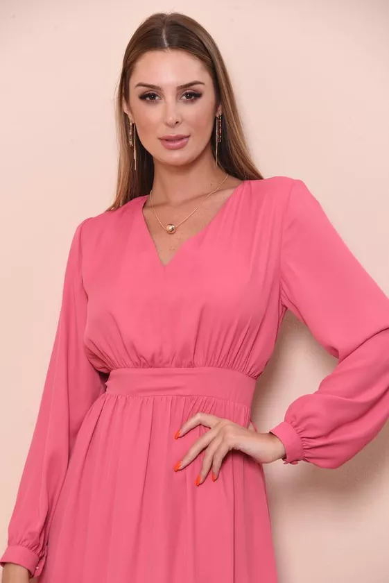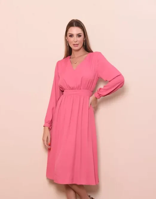 Vestido Midi Gisele rosa com decote em V, manga longa e cintura marcada. Leve e feminino, é perfeito para compor looks elegantes e delicados.