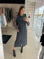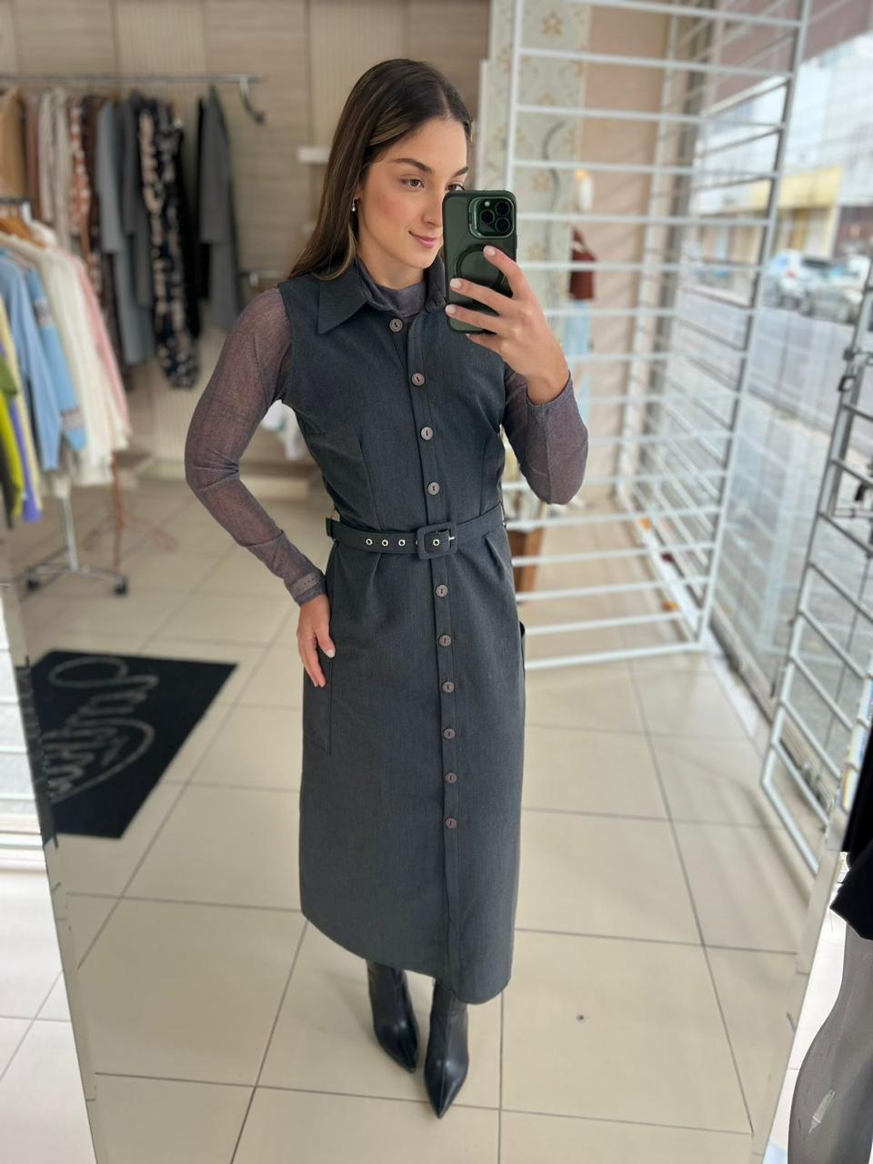 Este vestido sem mangas é elegante e prático, perfeito para diversas ocasiões. Possui uma gola com pé de gola que adiciona um toque sofisticado ao visual. Seu fechamento frontal com botões oferece praticidade e um detalhe charmoso. Equipado com bolsos laterais, combina estilo e funcionalidade. Com um comprimento maxi e modelagem levemente solta no corpo, proporciona conforto e liberdade de movimento. Acompanha um cinto para marcação na cintura, permitindo ajustes personalizados e valorizando a silhueta. Ideal para criar looks elegantes e versáteis com facilidade.